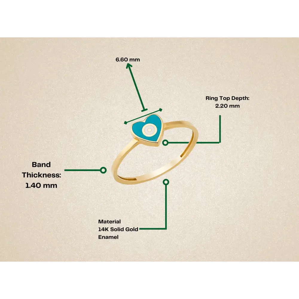 A unique blend of love and protection, this ring features a turquoise evil eye set in a heart-shaped design. Crafted from real 14K solid gold, it embodies both spiritual meaning and minimalist beauty — a symbol of good energy and heartfelt connection.