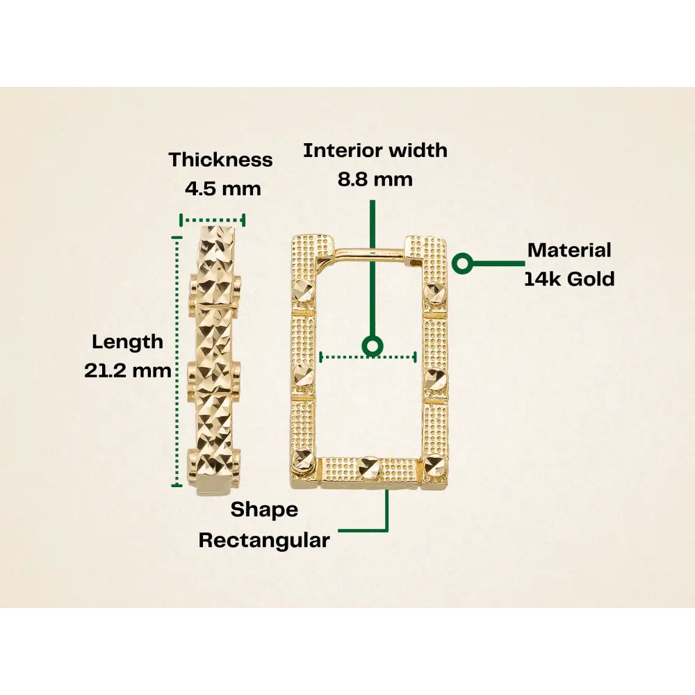 ✨ Add a modern twist to your jewelry collection with our Rectangle Hoops 14K Solid Gold Earrings. Featuring a chic diamond-cut design, these rectangular huggies sparkle beautifully with every movement. Their geometric shape makes them a bold yet timeless accessory, perfect for both everyday wear and special occasions.