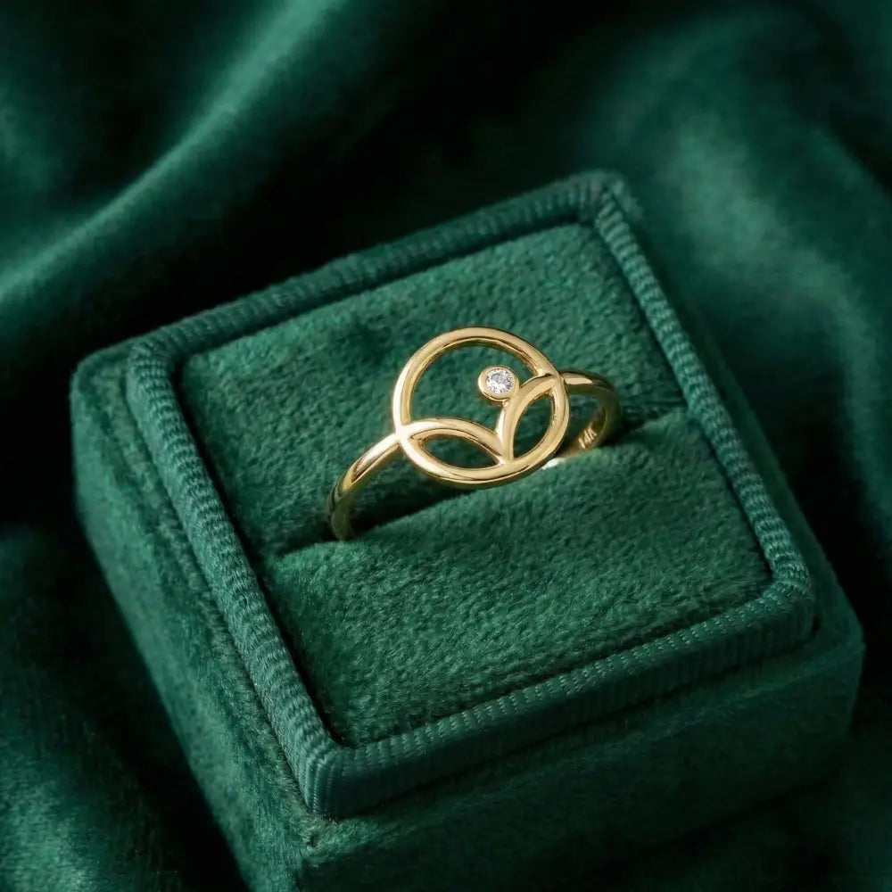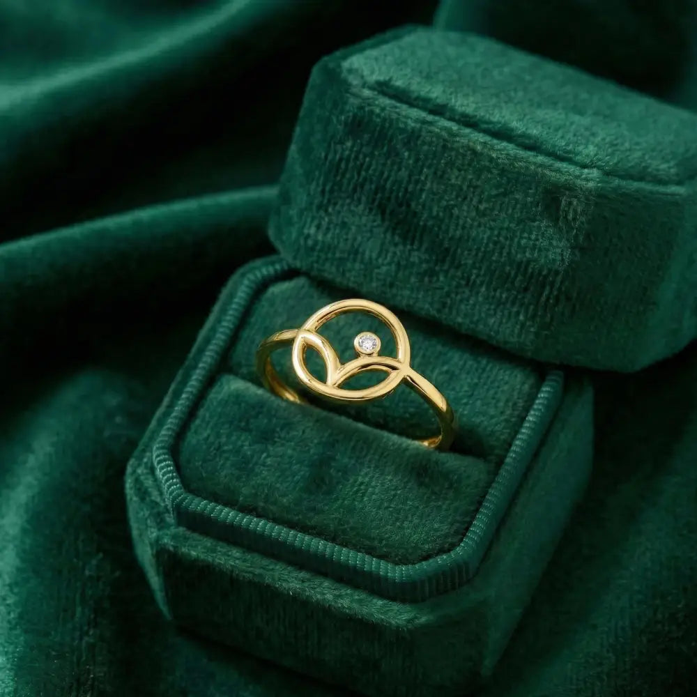 Find your balance with a touch of sparkle! 💫 This artistic **Open Circle Ring** is a masterclass in minimalist design. Framed by a polished gold circle, the interior features graceful, curved lines that resemble sprouting leaves or a stylized embracing figure. A single, bezel-set sparkling stone adds a focal point of light to this serene composition. ✨