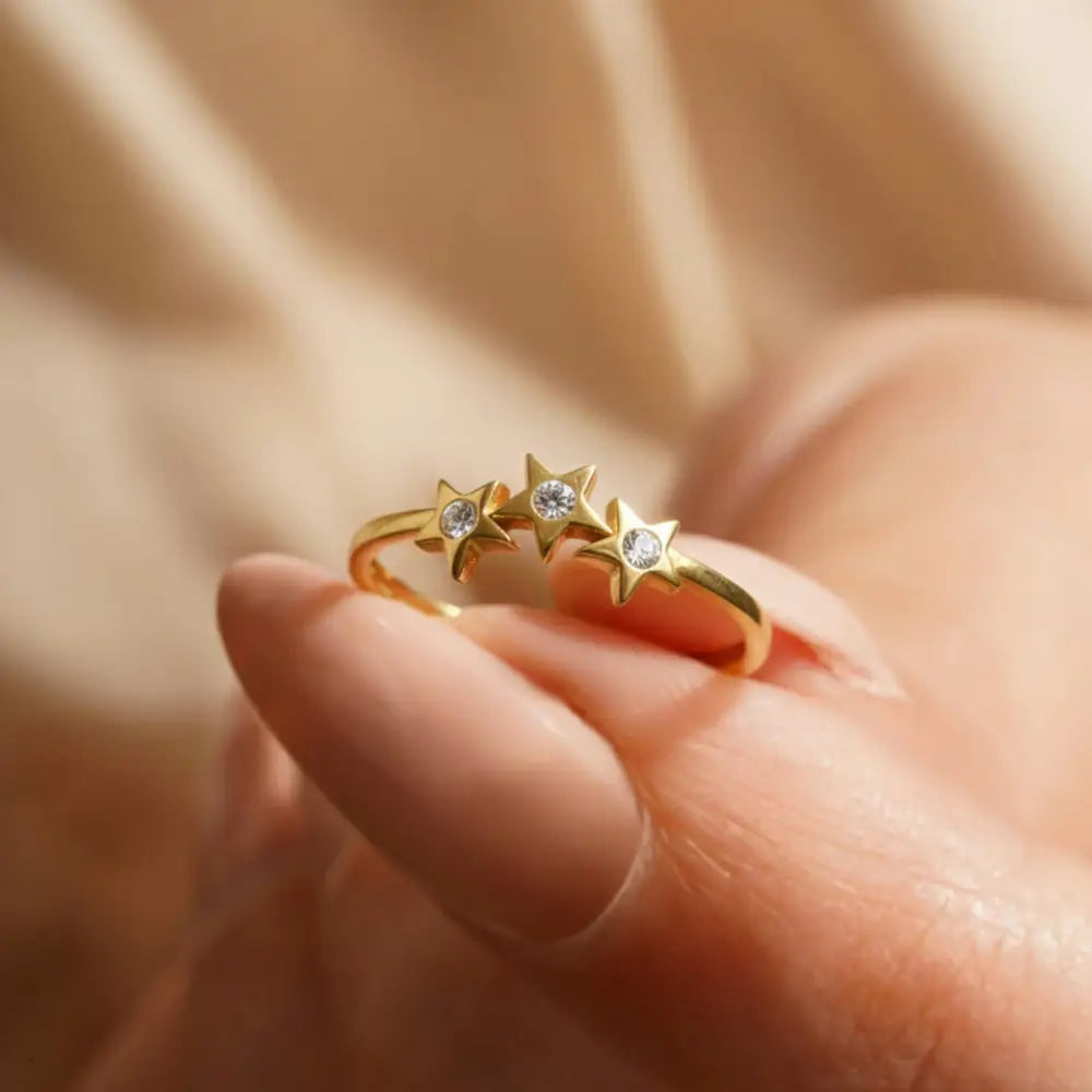 Wear a constellation on your finger! 💫 This dreamy **Triple Star Ring** captures the magic of the night sky. Three polished gold stars are arranged in a gentle curve, each set with a sparkling stone in its center to mimic the twinkle of distant galaxies. It’s a design that reminds you to keep looking up. ✨