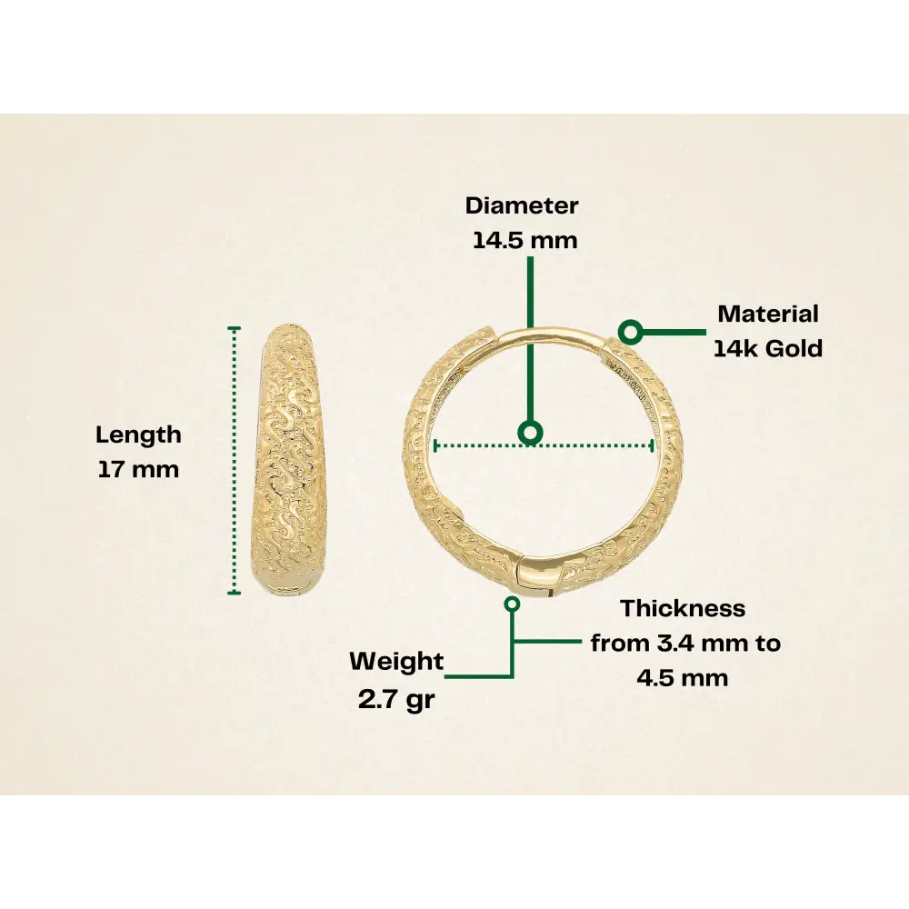Here is diamond cut earrings azura hammered huggie hoop earrings 14K solid gold. The 14.5 mm huggy hoops earring and everyday wear hoops are ideal for stacking or wearing alone.
