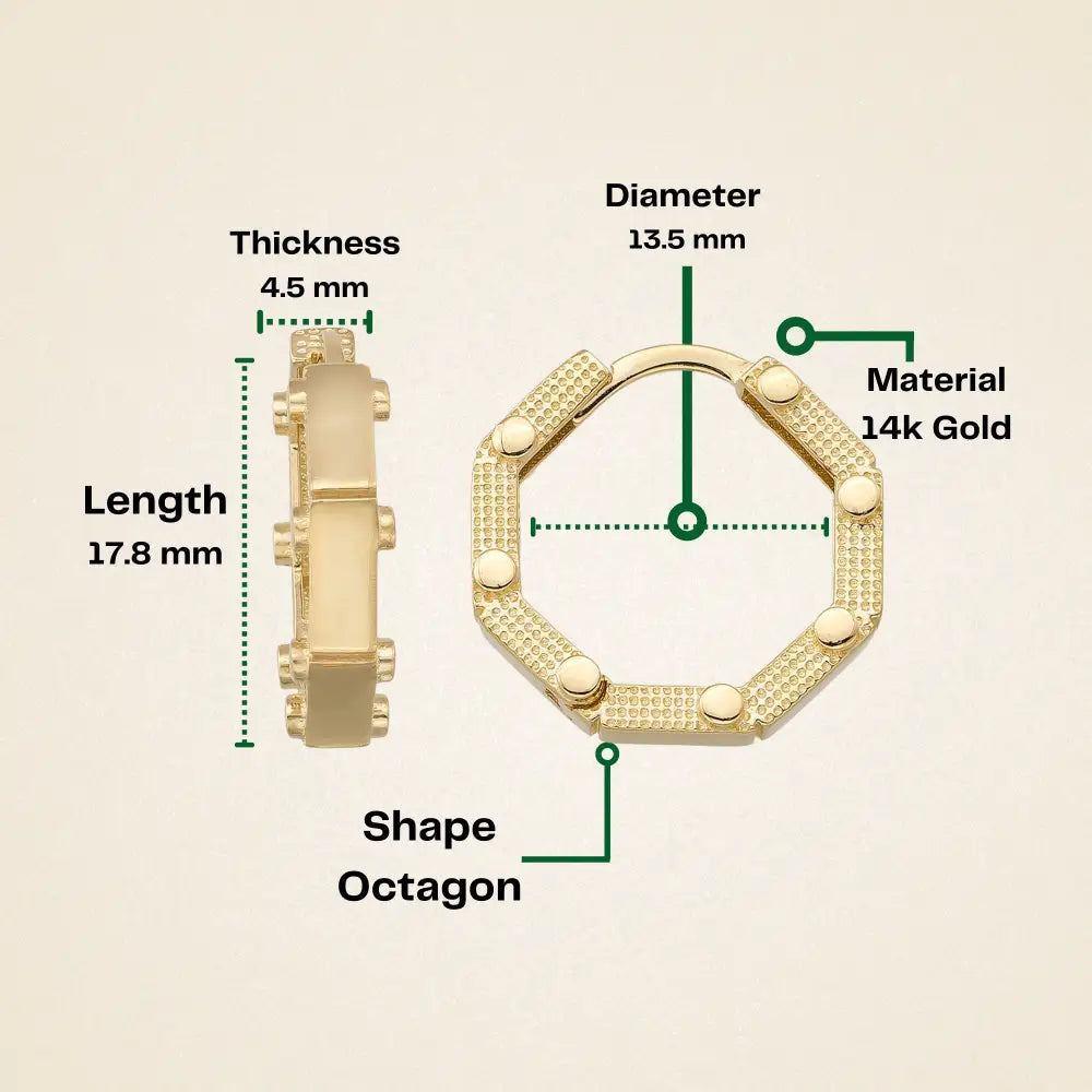 14K Solid Gold Octagon Hoop Earrings | 17.8mm Thick Huggie Hoops for Women