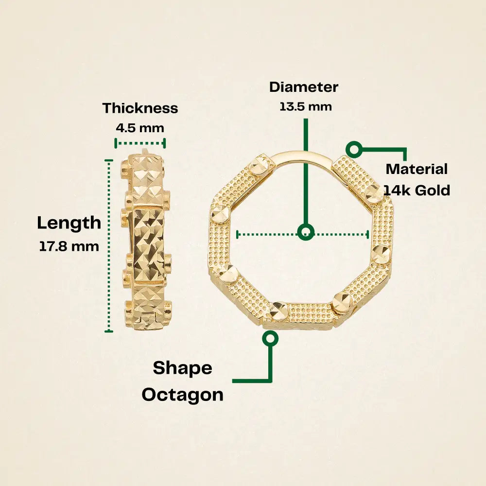 Octagon Hoop Earrings 14K Solid Gold | Diamond-Cut Ribbed Geometric Huggies, 4.5 mm Thick 17.8 mm Hoops for Women